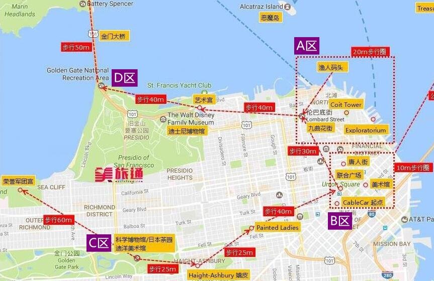 :旧金山市区,包括联合广场,旧金山美术馆,以及铛铛车的起点