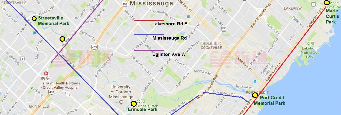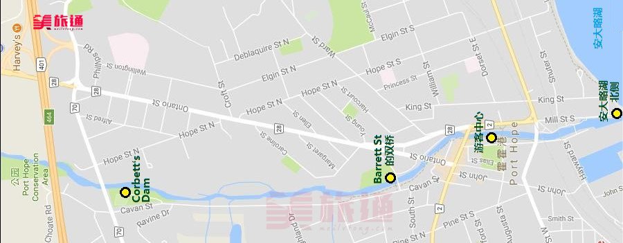 沿安大略湖以北的河流沿岸有多处观鱼点(下图顺时针转90度)