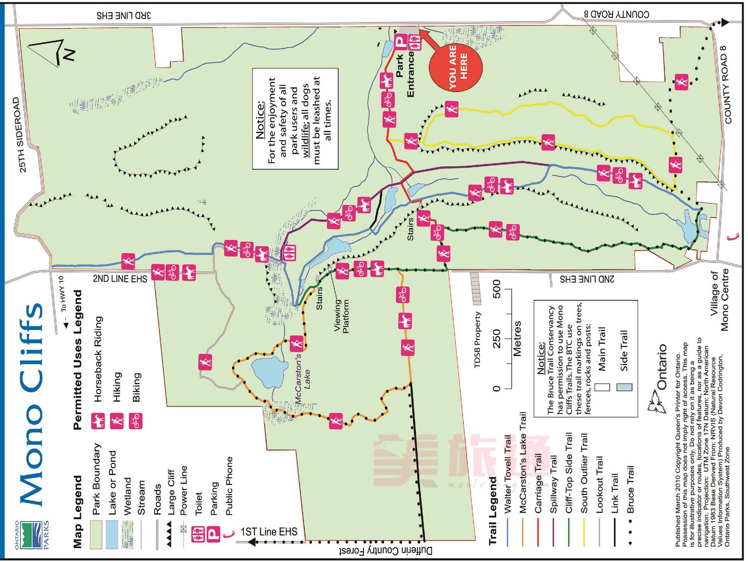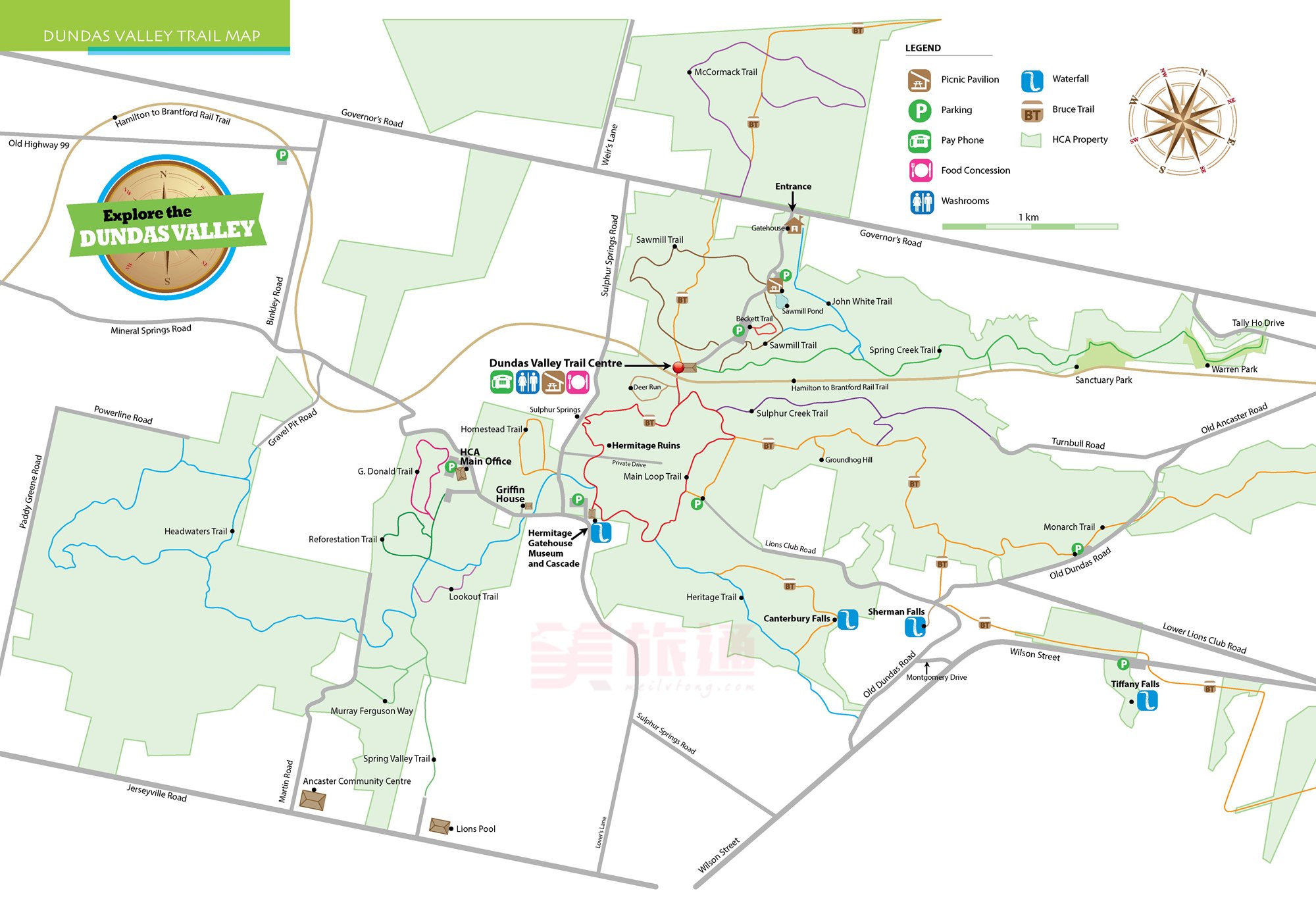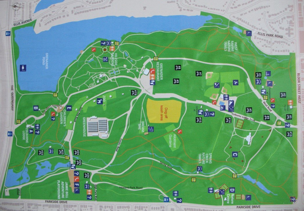 主路Don Valley Parkway比较常走,但是多数人都不知道它下面隐藏的风景。有一个小停车场,从停车场出发,可以前往池塘边有池畔环线(Moccasin Pond Loop,绿线),也可以直接走Moccasin Trail(紫线);停车场的位置相对较高,往北或往东走都是下坡,具体可参考道路详情。走Moccasin Trail向东可以穿过隧道,隧道就是在主路下面,这里的隧道口是做成彩虹样(见下图)。之后可以过桥到East Don river河对面,衔接East Don Trail。(图片来自这里)