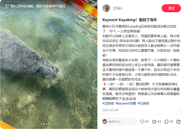 推荐小红书笔记:Keywest Kayaking!看到了海牛