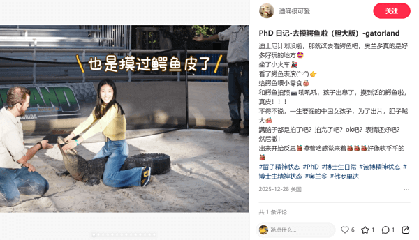 推荐小红书笔记:PhD 日记-去摸鳄鱼啦(胆大版)