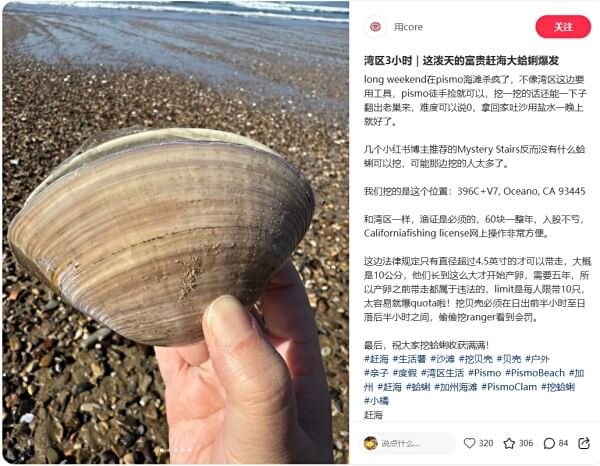 ‣ 挖蛤蜊 - 但不能随意挖,必须购买了 California Fishing License(日票20,年票60)+ 日出前半小时到日落后半小时才能挖,挖到后只有直径大于4.5英寸(11.43厘米)的蛤蜊才能带走,并且每人每天最多带走10只。最佳挖蛤蜊时间是负低潮时,Tide Chart 见这里