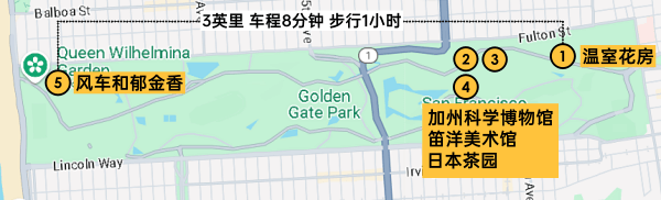 ‣ 乘坐巴士 No.44 O’Shaughnessy bus 到 Music Concourse Dr/Academy of Sciences,就在加州科学博物馆前 公园景点地图: