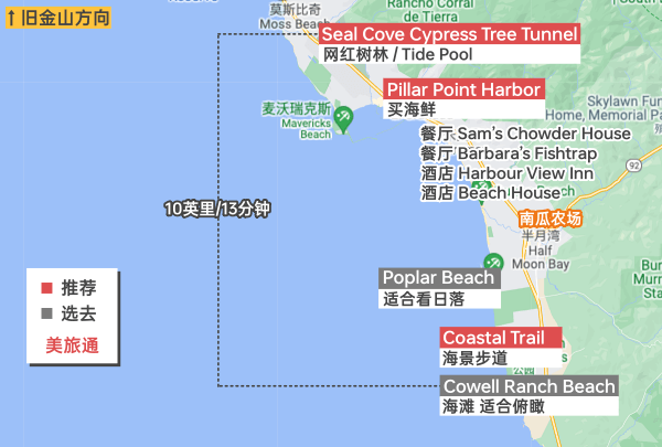 :附近的 Mavericks Beach 可以赶海,但区域内有 sneaker waves,不注意的话会有溺水风险,并且捞到的海鲜可能有毒素!总之,需要认真做功课,不建议一时兴起就去玩