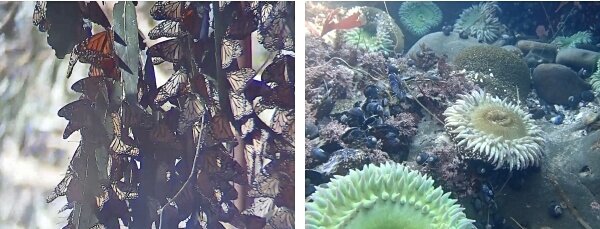 10月中到2月都能看到蝴蝶,但11月数量最多。这些蝴蝶诞生在夏天的北方(比如华盛顿州)和内陆地区(比如犹他州),秋天时飞到加州海岸过冬,次年2月又飞回出生地,繁殖后死亡 ... 所以不要总从山川/大海/宇宙的角度看待人生,和蝴蝶比,我们的一生那是相当精彩且有意义了!