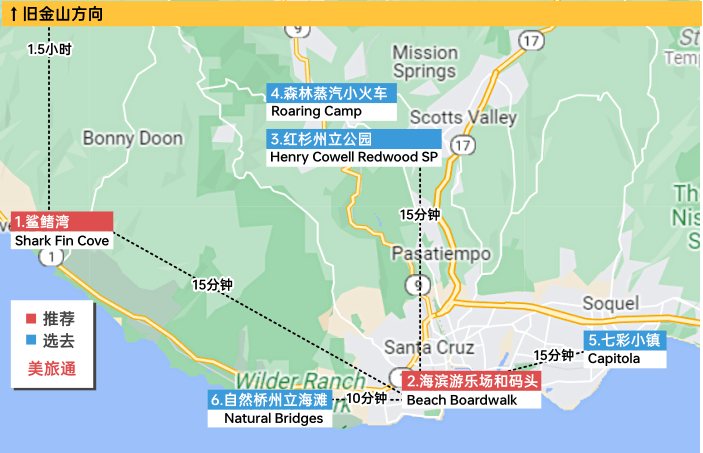 有各式海滩,游乐场,以及穿梭在红杉林中的蒸汽火车