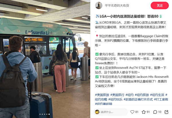 推荐小红书笔记:LGA一小时内丝滑到达曼哈顿!怒省80