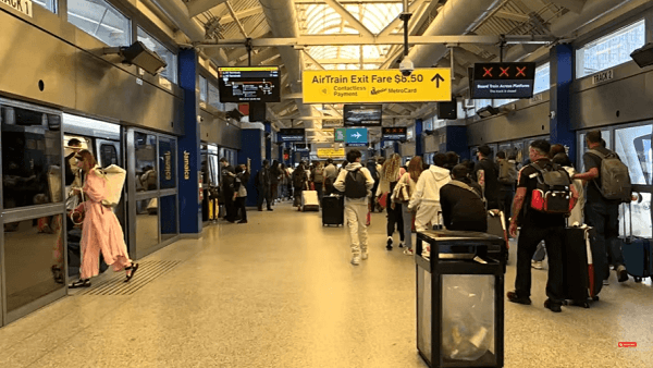 > 跟随指示牌找到 AirTrain(指示牌非常清晰),看对方向,坐到 Jamaica Station 下车,票价8.5美金(到站后再买票出闸机,支持 Apple Pay)