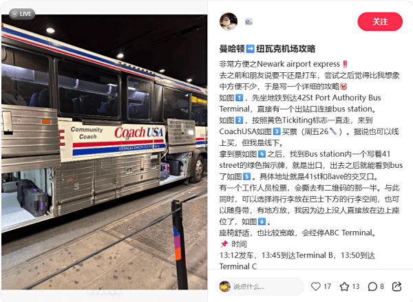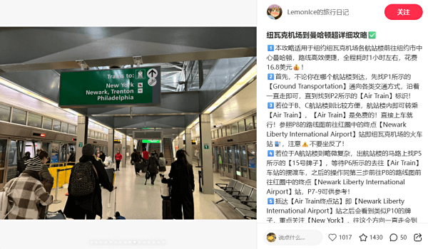 推荐小红书笔记:曼哈顿➡️纽瓦克机场攻略