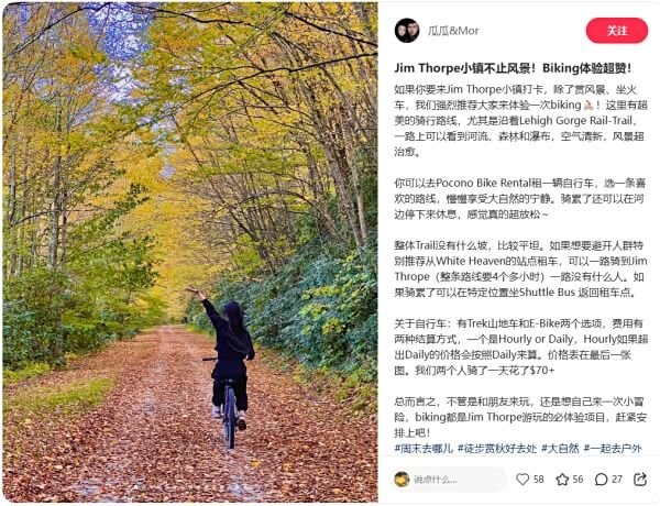 备注:小红书笔记 Jim Thorpe小镇不止风景!Biking体验超赞! 分享了骑行玩法,我觉得也很赞,就是骑行时间有点长 ... 体力好的同学请自行阅读,笔记里提到的租自行车网站 点击这里