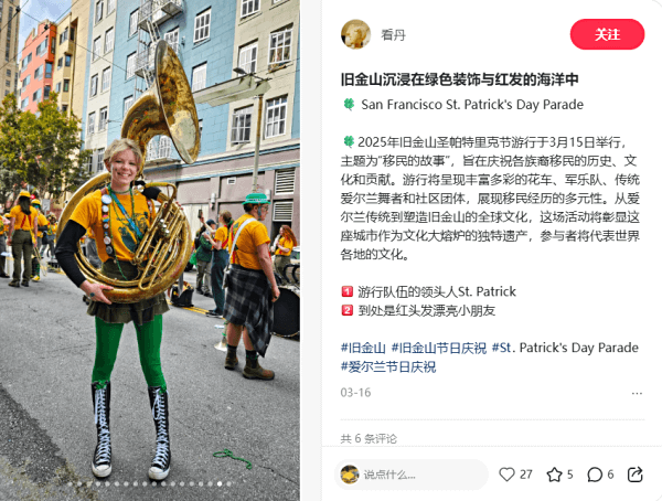 推荐小红书笔记(去年):旧金山沉浸在绿色装饰与红发的海洋中