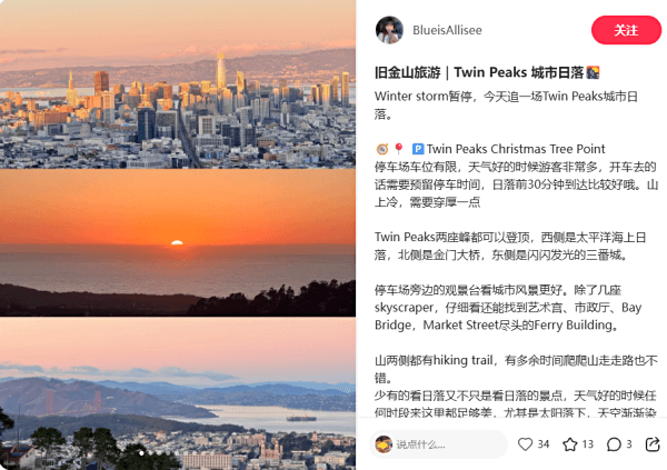 推荐小红书笔记:旧金山旅游|Twin Peaks 城市日落