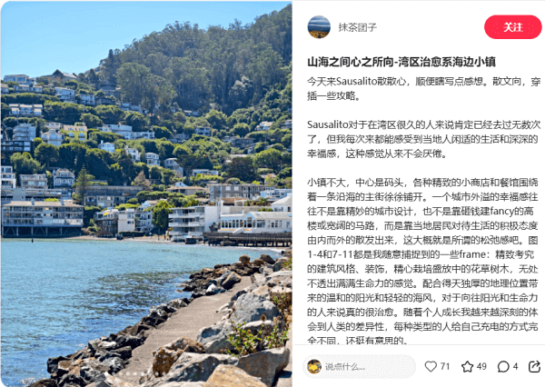 游客喜欢来这里,主要是因为小镇比旧金山更阳光 + 依山傍海的悠闲氛围