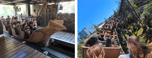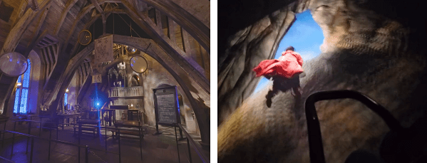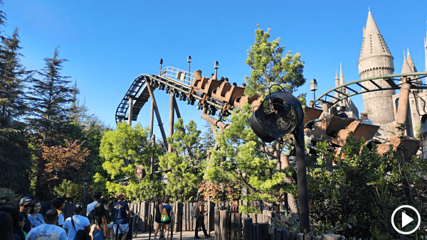英文名称:Harry Potter and the Forbidden Journey 查看地图 身高要求:122厘米 简介:游玩形式是步行进入霍格沃茨城堡,简单参观,然后坐上室内过山车 - 座椅被安装在工业机器人的机器臂上,机器人的移动速度很慢,但机器臂通过倾斜/摆动实现了最高时速25英里/40公里的动作幅度,加上物理布景和3D效果,感官上会很刺激(因为摄魂怪乱飞,小朋友大概率会害怕,请慎重选择 ... 此外,貌似这种技术有些缺陷,会让人有不同程度的眩晕感 ...) 故事设定:游客作为麻瓜参观霍格沃兹,赫敏用魔法让长椅飞起来,带你们参观魁地奇比赛,但途中陷入混乱,闯入禁林,遭遇龙/蜘蛛/摄魂怪的袭击,哈利多次救援,最后安全返回城堡 推荐视频:Harry Potter and the Forbidden Journey