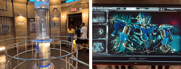 英文名称:Transformers: The Ride-3D 查看地图 身高要求:102厘米 简介:室内虚拟过山车(在两个房间里来回平移),非常有趣,也不吓人 故事设定:游客加入人类-汽车人联盟(N.E.S.T.),任务是保护火种源(AllSpark),期间卷入擎天柱和威震天/红蜘蛛的对抗,最终汽车人获胜 推荐视频:Transformers: The Ride 3D - REOPENS