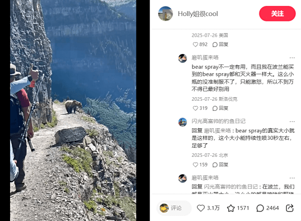 这个国家公园的遇熊概率很高!灰熊密度也是所有国家公园中最高的(阿拉斯加之外)2024年9月,有1名徒步者在 Highline Trail 被熊咬伤膝盖以下(他的同伴后来用喷雾赶走了熊),2025年8月另一名徒步者在 Lake Janet Trail 被熊袭击肩部和手臂(也是依靠同伴使用喷雾得救),下面这个狭路遇熊事件则发生在2025年8月的 Highline Trail