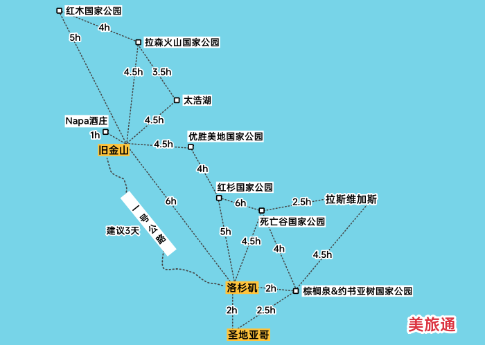 2. 旧金山 > 一号公路 > 洛杉矶 > 圣地亚哥 > 棕榈泉+约书亚树国家公园 > 拉斯维加斯 > 死亡谷国家公园 或 红杉国家公园+优胜美地国家公园 > 旧金山