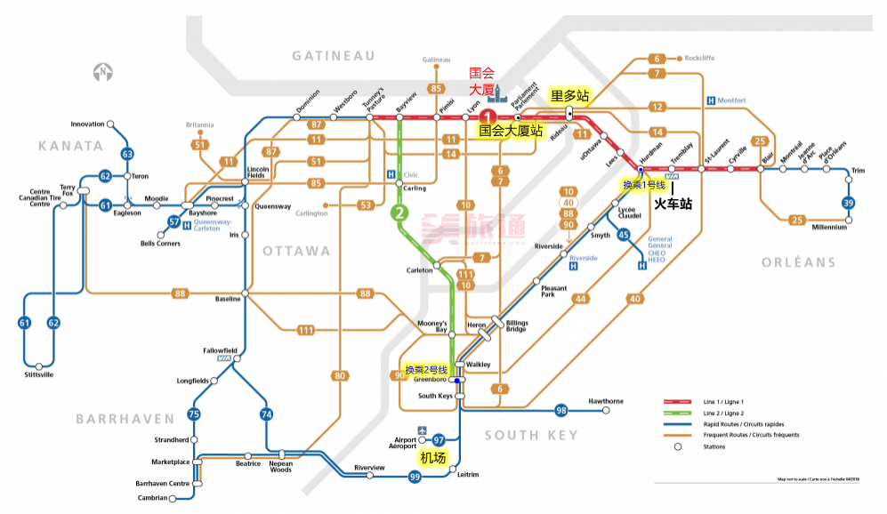 渥太华地理位置比较特殊,由于渥太华首都地区跨加拿大两个省(魁北克省和安大略省),两省以渥太华河中心为分界,因为公交系统也分成两部分,分别由两家运营。OC Transpo负责渥太华河以南安大略这边运营;Société de Transport de l’Outaouais(STO)负责魁北克部分的运营。你可以在两个公交系统之间换乘,换乘位于渥太华沿Rideau街和Wellington街地区,以及Gatineau位于Maisonneuve Boulevard大街的Place d’accueil广场周围。