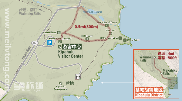 PiPiwai Trail,单程2mi[3.2km];到Makahiku瀑布800米,到竹林1.6km
