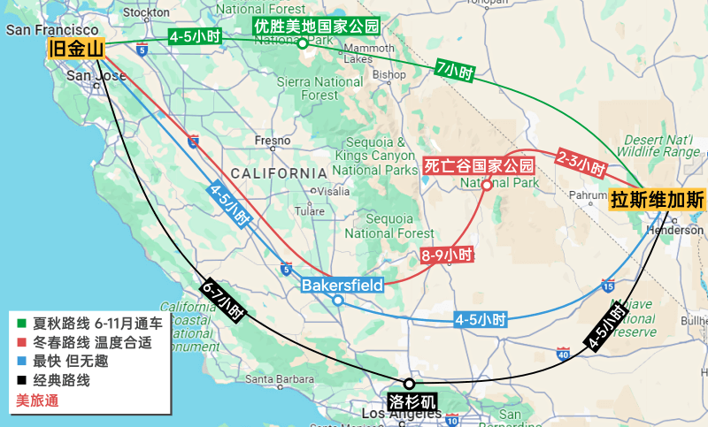 - 或者先驾车283英里/4-5小时到 Bakersfield 过夜,次日再去 拉斯维加斯
