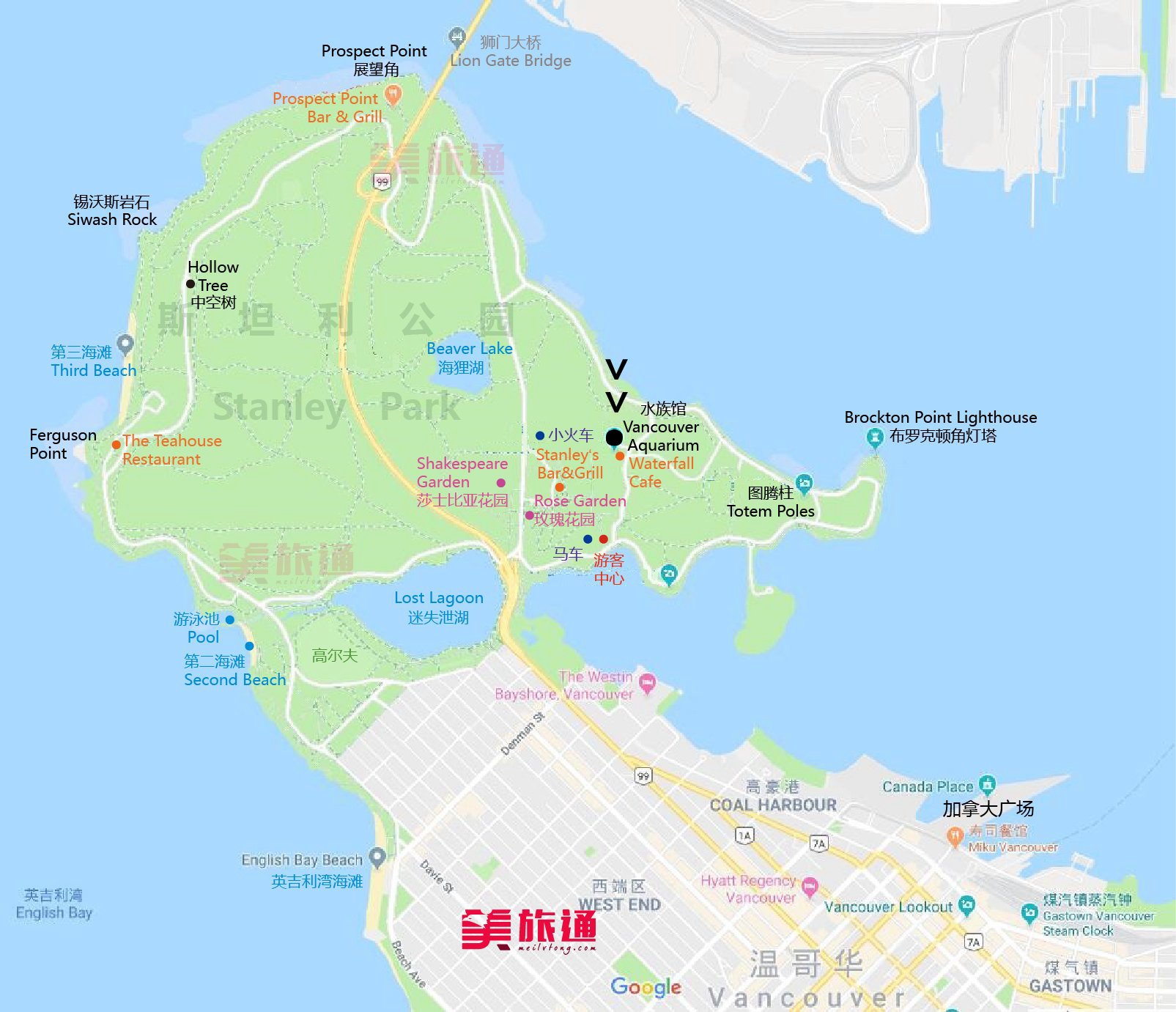 乘公交车19路,在斯坦利公园内的终点Stanley Park Loop站下车,步行5分钟内即可抵达水族馆(见下图)