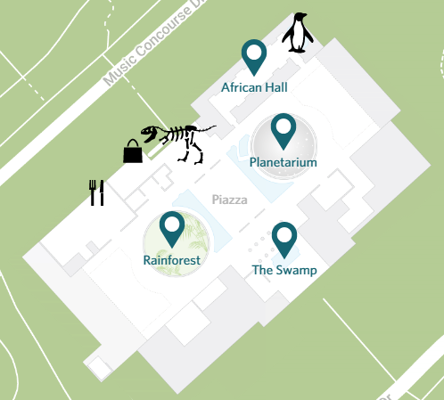 博物馆的英文名称是 California Academy of Sciences,位于金门公园内,耗资5亿美金打造,包含天文馆,水族馆,雨林馆等场馆